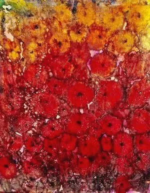 Abstraktes Gemälde mit drei großen Blumen in Blau, Rot und Gelb, vor buntem Hintergrund in verschiedenen Farben.